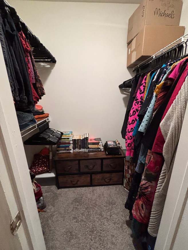 The photo you see is me taking a step back from my closet. I haven’t really been able to bring myself to actually start this project until pretty much earlier this evening. I’m going to keep working after this and my initial discussion board post for school this week. After that, who the heck knows what’s gonna happen.