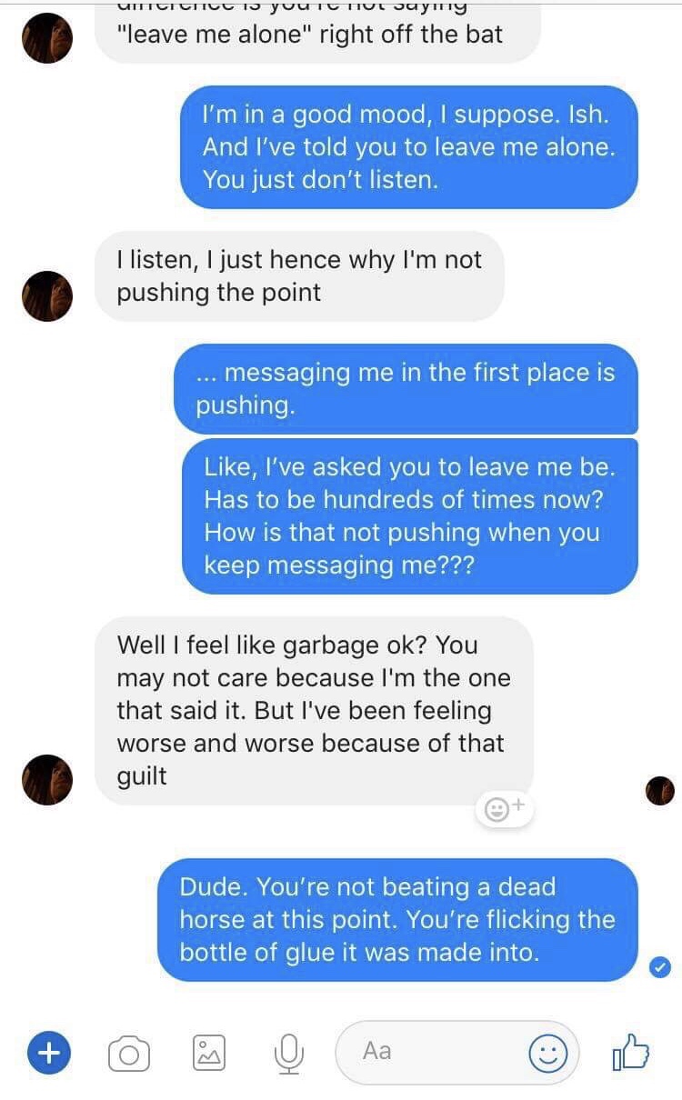 I’m not suicidal, at least. Just…tired. Sad. Sore. I’m tired of the stalker ex-boyfriend being a disrespectful jackass. For the record: if you call me a whore and maliciously compare me to someone who abused me, you don’t get my sympathy. You get an acknowledgement of your apology but not my damn forgiveness. You don’t get to spend the next two plus years stalking me on every social media platform you can locate and be a creepy bastard begging for attention. I don’t have to forgive anyone. I don’t have to do a damn thing but make myself happy, try to make my wife happy, pay taxes, and die eventually. I don’t have to forgive someone. I especially don’t have to forgive someone when they seem to be incapable of taking ‘no’ for an answer. And I’m over it. Actually, I’m this over it:
