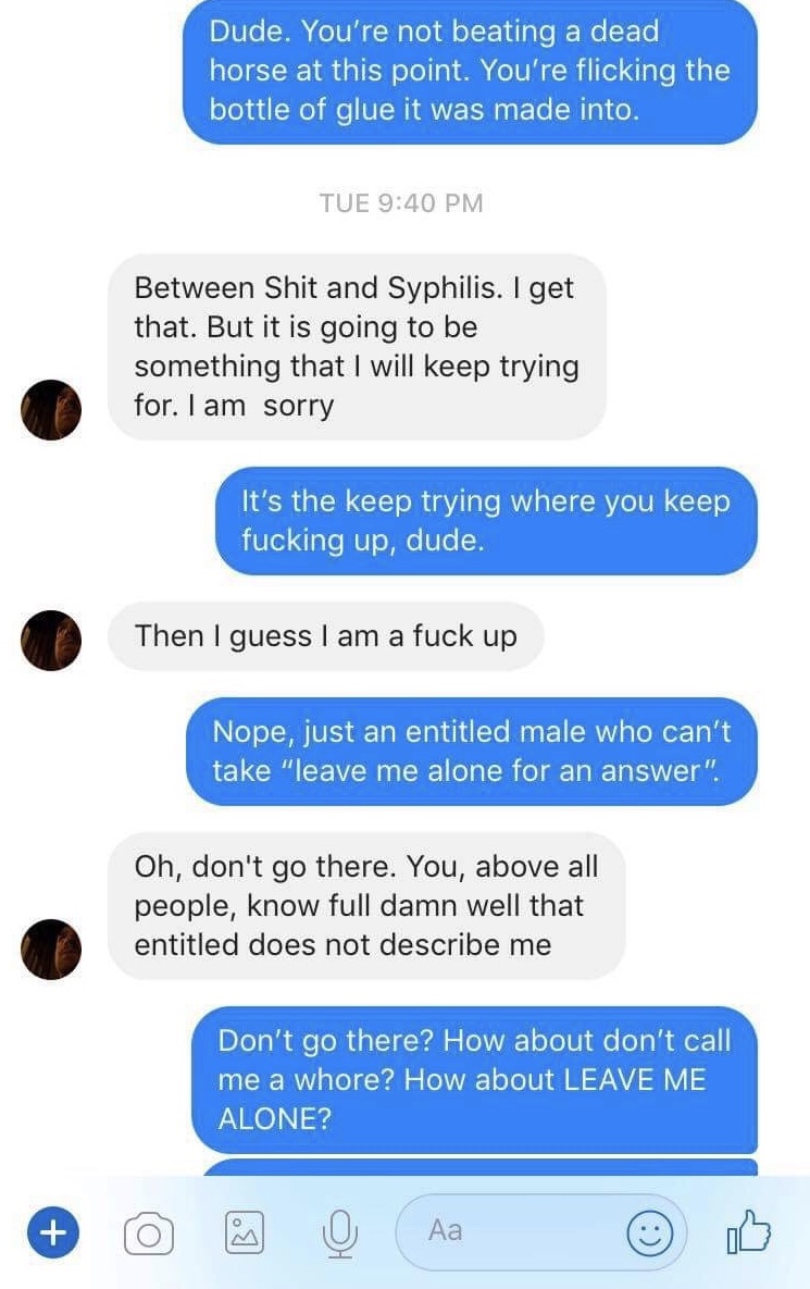 I’m not suicidal, at least. Just…tired. Sad. Sore. I’m tired of the stalker ex-boyfriend being a disrespectful jackass. For the record: if you call me a whore and maliciously compare me to someone who abused me, you don’t get my sympathy. You get an acknowledgement of your apology but not my damn forgiveness. You don’t get to spend the next two plus years stalking me on every social media platform you can locate and be a creepy bastard begging for attention. I don’t have to forgive anyone. I don’t have to do a damn thing but make myself happy, try to make my wife happy, pay taxes, and die eventually. I don’t have to forgive someone. I especially don’t have to forgive someone when they seem to be incapable of taking ‘no’ for an answer. And I’m over it. Actually, I’m this over it: