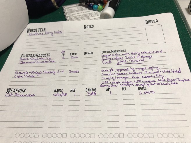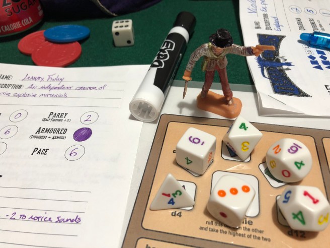 And I got to use my new dice! Rainbow Dice! It’s the return of Lenox Finley and the Finley Howling Cremation Lacerator and Finley’s Shattering Cable Globe!