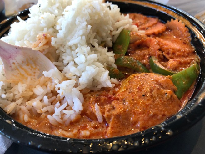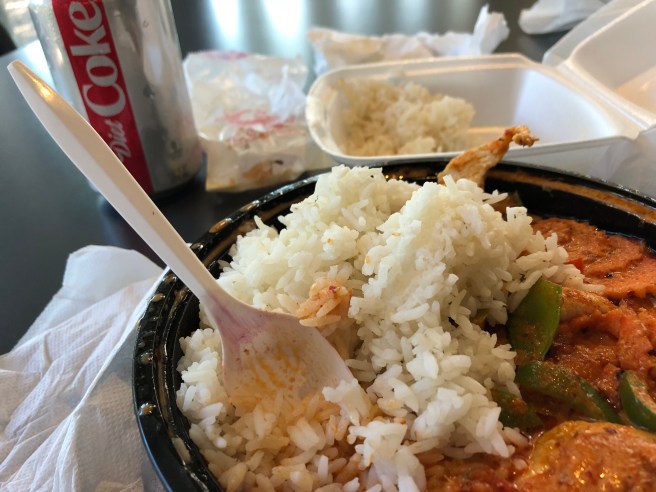 I was treated to lunch today by a dear friend. We took a quick trip to the amazing Thai Food Truck (that will be back December 4th before they’re gone for a month visiting family, friends, and various places in Thailand). We are friendly with the man who takes the orders, and his wife who does most of the cooking with her, I believe, sister in the truck itself. I got Thai Hot Chicken Panang Curry, one of my favorite red curries. My friend got regular mild, and it was still a little spicy. Mine certainly cleared out my sinuses!