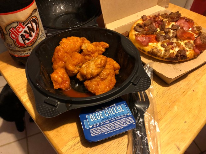 And, she provided the best Friday meal: pizza and hot wings! Yours truly provided the poison of choice: diet root beer.