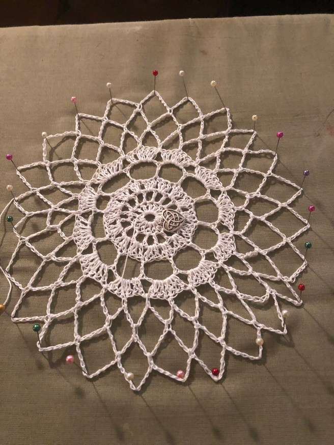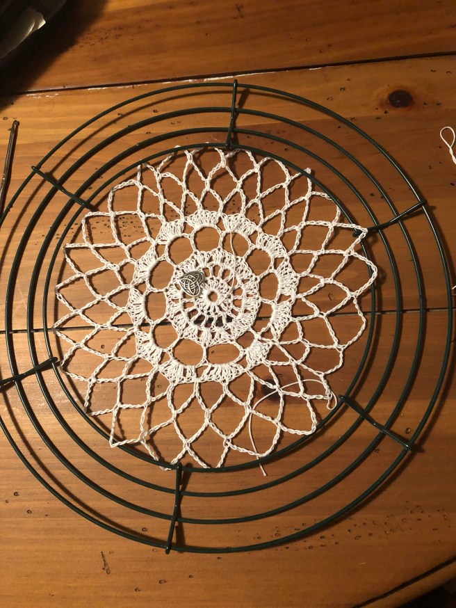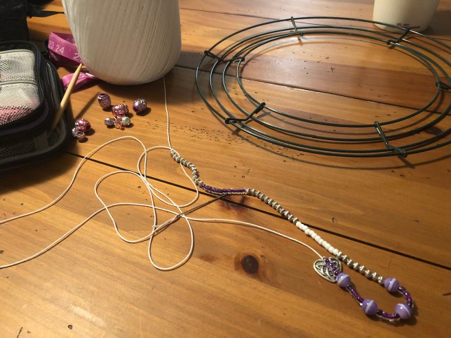 A 12″ wire floral frame, some beads that I test strung before using them, a central pendant, some size 10 crochet thread, a size zero steel crochet hook, scissors, a needle to three the beads on, and a whole lot of patience.
