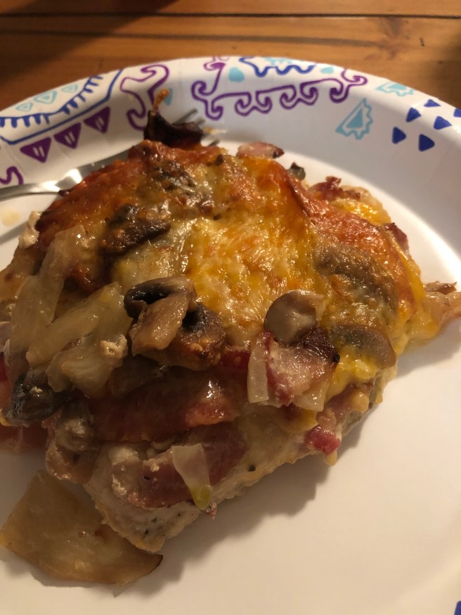 Chicken, bacon, onion, mushrooms, and cheese. Mmmmm! I think next time I’d cut the chicken down further and try to remember to take the chicken out of the freezer earlier the day before so it is better defrosted.