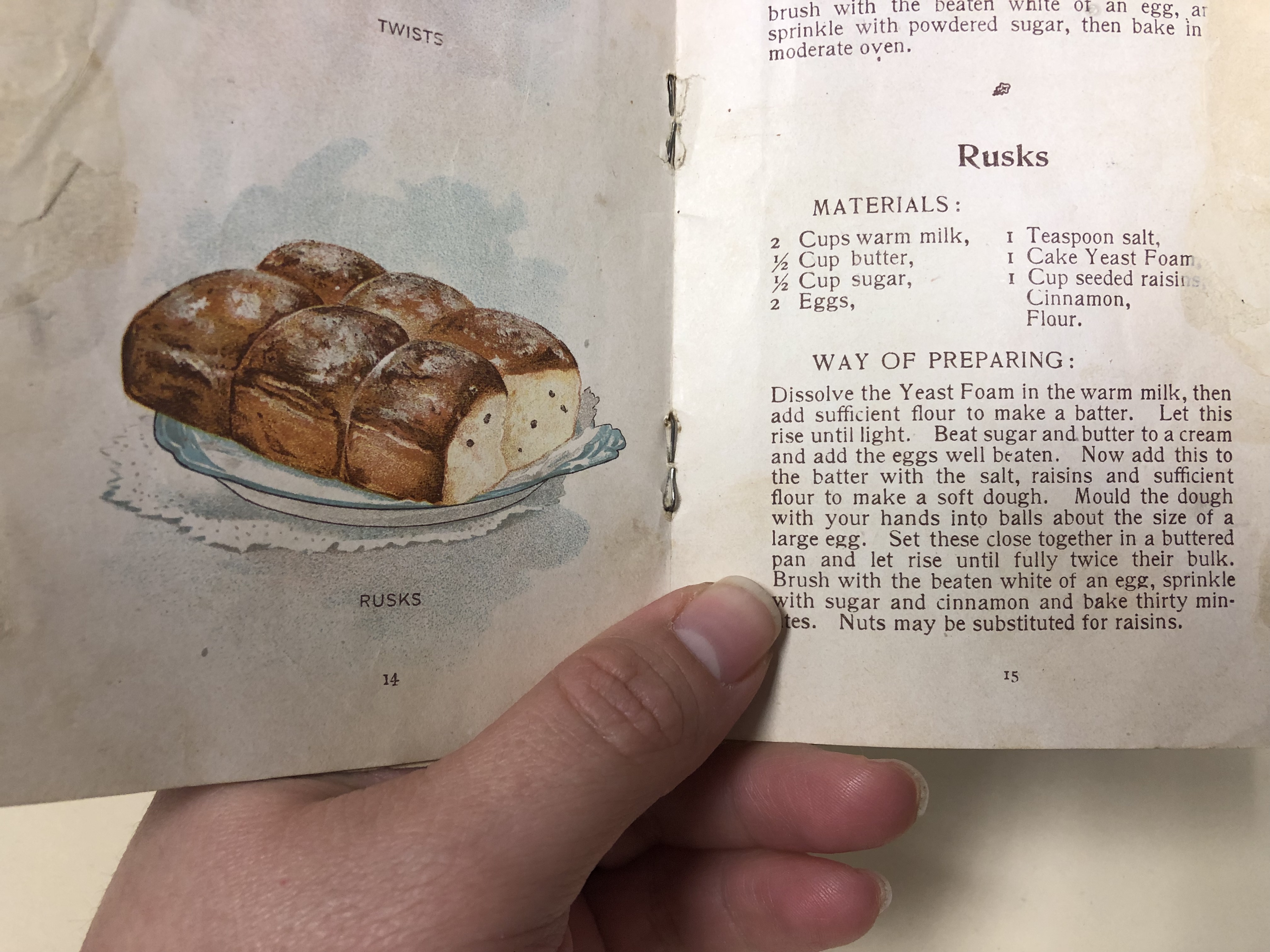 Here’s this month’s recipe, again courtesy of Mrs. Nellie Duling Gans, Principal of the Chicago Cooking College’s pamphlet “Good Bread: How to Make It“. This super flexible sweet roll has some heavy memories for me.