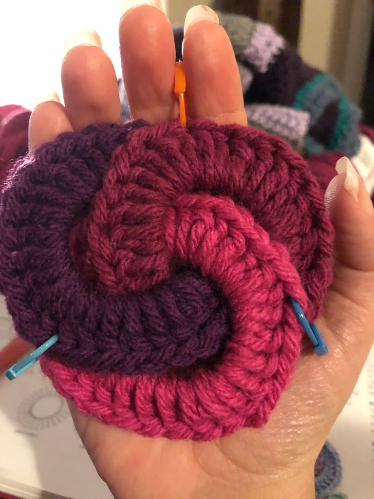 I’ve gotten all twenty one of the initial motifs done and I’m working on getting them ringed to get larger before I join them together. I might do another seven just to have twenty eight motifs, but I kind of like the three by seven, since Meg is so tall.