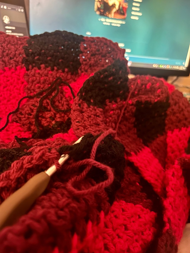 I’m still working on my godfather’s Buffalo Plaid Blanket. I think I’m almost done with it; I still need to do a few more repeats of the pattern and the border, which takes forever and a half.