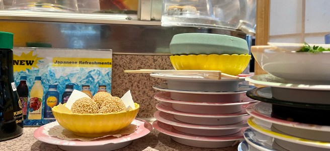 I’ve never been to a conveyor sushi restaurant before. It was quite an interesting experience. Well worth the drive with attentive servers, delicious food at a good cost. I got tamago, the slightly sweet egg nigiri, to kick off. And then two orders of a four piece spicy California roll, some fresh gyoza, some pieces of a non-shrimp having spicy roll. And then, of course, I had to try something new that I knew wasn’t going to make me sick. It was semi-fatty tuna nigiri, so just the thick slice of tuna over formed rice. It was… tuna-y, but not entirely to my liking. But I tried it!