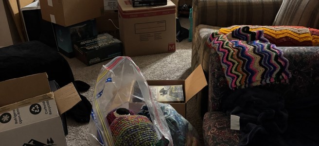 We were actually able to get the living room under control today. Meaning: that we unloaded everything off of the metal shelf in the corner, moved to the shelf, and then slowly put everything back. Oh, and shoved the couch, armchair, both end tables, and the television into place.