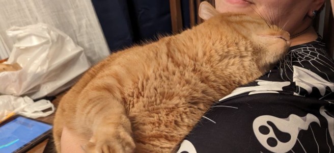 I moved to Indiana just after the New Year of 2023 in the back of Uncle Comic’s transport van, sitting beside Spock as he napped in his carrier. Living with Mellon, Tom, and Dustin has been an adventure in the mostly positive. Sure, there are still dishes in the sink right now, but home is where the heart is. And between Mellon and Spock, this is home. It’s also where the yarn and books are, but that’s material goods and craft supplies. To be fair, half my worldly goods are books and craft supplies, all covered in cat hair.